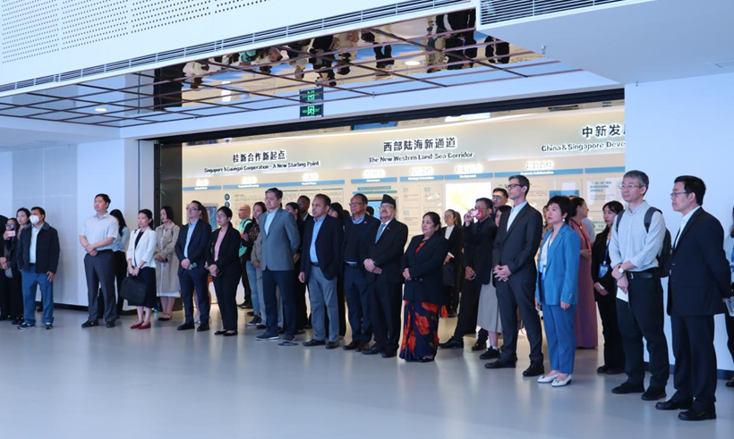 在中新物流園,使節(jié)團(tuán)通過參觀展廳、聽取介紹、互動(dòng)交流等方式詳細(xì)了解園區(qū)的發(fā)展情況,對(duì)西部陸海新通道的戰(zhàn)略地位與廣西在其中的作用有了更深的認(rèn)識(shí)。中新物流園是廣西參與“一帶一路”及推進(jìn)中國與新加坡互聯(lián)互通、西部陸海新通道建設(shè)、海洋經(jīng)濟(jì)發(fā)展的重大項(xiàng)目之一,自2018年10月開工建設(shè)以來,園區(qū)發(fā)展迅猛,產(chǎn)業(yè)集聚效應(yīng)加速顯現(xiàn),現(xiàn)已引進(jìn)超30家世界500強(qiáng)和中國100強(qiáng)龍頭企業(yè)進(jìn)行合作,共同實(shí)施項(xiàng)目建設(shè)與運(yùn)營。