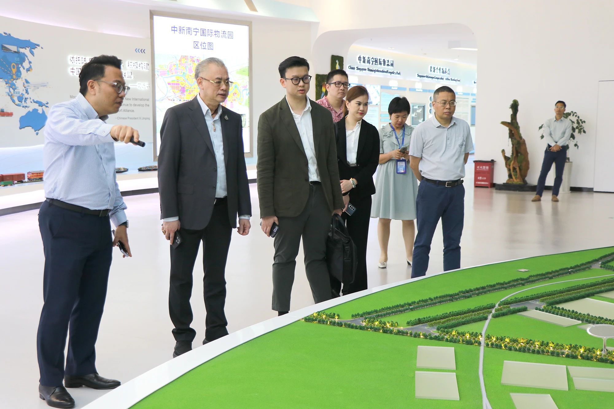 在中新物流園展示中心,考察團(tuán)一行深入了解項(xiàng)目的整體情況。作為國際陸海貿(mào)易新通道上重要的物流樞紐節(jié)點(diǎn)項(xiàng)目之一,園區(qū)堅(jiān)持以“強(qiáng)中選強(qiáng),優(yōu)中選優(yōu)”重點(diǎn)引進(jìn)大型物流龍頭企業(yè)為招商理念和工作方針,目前已引進(jìn)超30家世界500強(qiáng)和中國100強(qiáng)龍頭企業(yè)進(jìn)行合作,共同實(shí)施項(xiàng)目建設(shè)和運(yùn)營。同時(shí),為能更好地?fù)屪CEP新發(fā)展機(jī)遇,中新物流園與時(shí)俱進(jìn)不斷創(chuàng)新,于2021年聯(lián)合中國—東盟博覽會秘書處共同打造了獨(dú)具特色的匯聚中心,通過線上數(shù)字化平臺+線下展館沉浸式商貿(mào)體驗(yàn)相結(jié)合的方式,致力于搭建一個(gè)中國與東盟、RCEP其他區(qū)域國家乃至“一帶一路”沿線重要國家線上線下經(jīng)貿(mào)往來的一站式首選平臺。