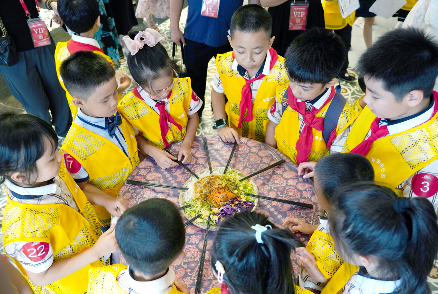 在馬來西亞館,東盟“小記者”們在現(xiàn)場親身體驗了地道的東南亞華人傳統(tǒng)習俗——“撈生”儀式,即把裝在盤子里的食材用筷子反復高高夾起,“撈”得越高,寓意越吉祥。通過趣味“撈生”,寄語孩子們學習更上一層樓、德智體美勞全面發(fā)展的美好愿望。