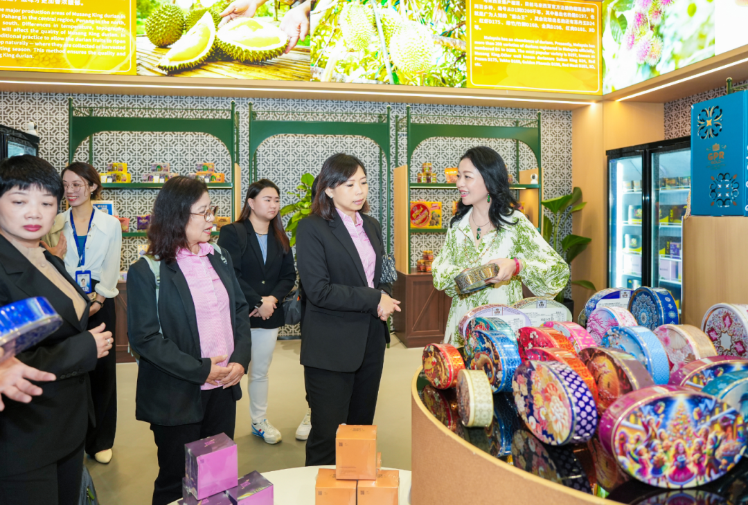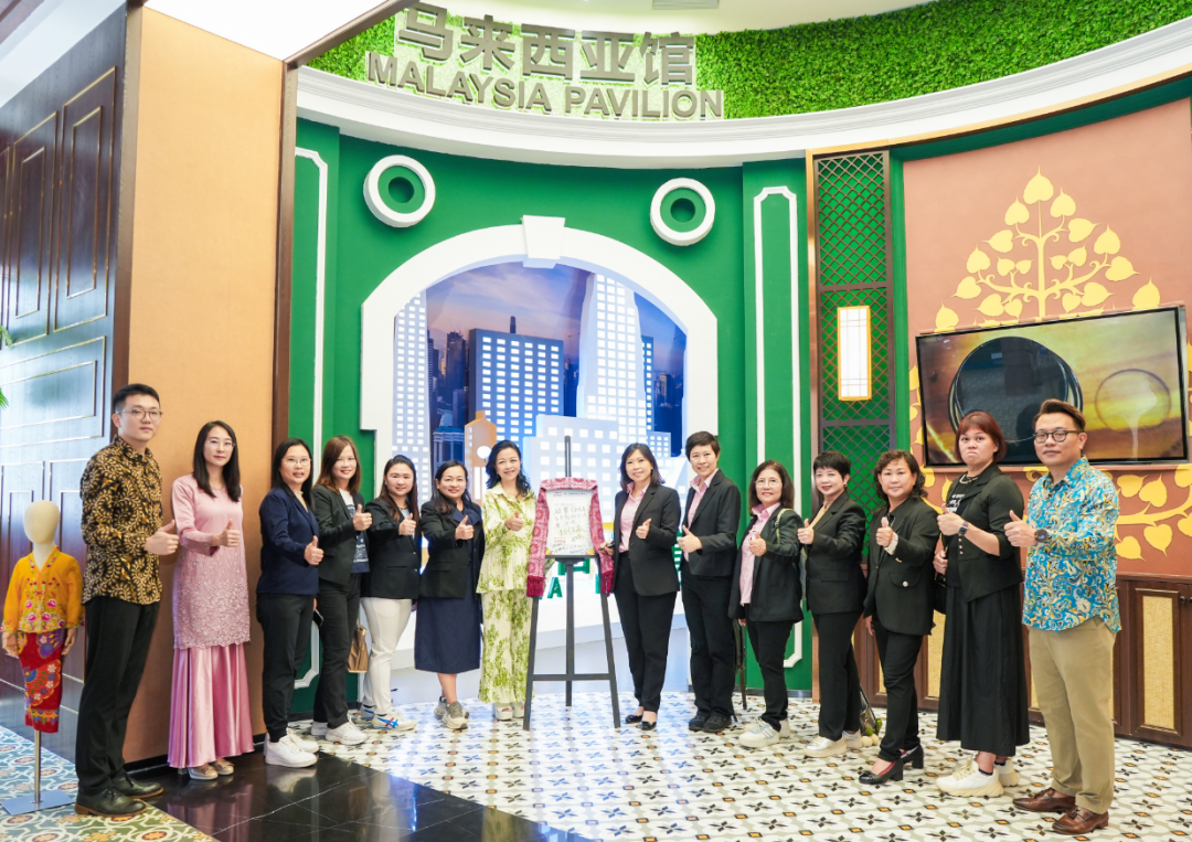 來到馬來西亞館,各類富有當(dāng)?shù)靥厣娜宋娘L(fēng)俗與“僑元素”生動呈現(xiàn):從標(biāo)志性的雙子塔、五大經(jīng)濟(jì)走廊,到傳統(tǒng)巴迪布、高腳屋和榴蓮樹造景,無不喚起代表團(tuán)的熟悉與親切之感。館內(nèi)還陳列了燕窩、巧克力、白咖啡等特色商品,進(jìn)一步增強(qiáng)了實地體驗的氛圍。大家紛紛就館內(nèi)已入駐商品的運(yùn)營推廣情況,進(jìn)行詳細(xì)的了解和探討。在得知各館均有相應(yīng)館長對商品進(jìn)行管理與推介時,代表團(tuán)更是稱贊連連。